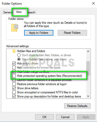 - Select the tab View and uncheck the option Hide protected operating system files. If prompted with a warning, press Continue. Press Apply to save changes.