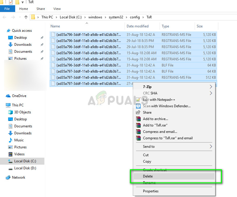 - Now delete all the files with the extension REGTRANS-MS and BLF.