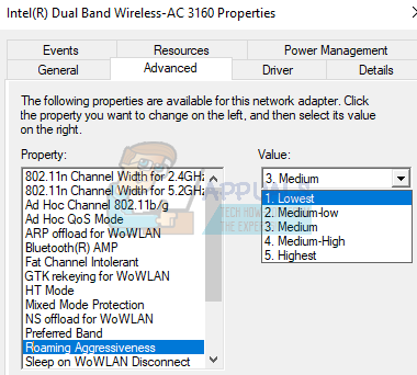 - Once in the properties, navigate to the Advanced tab and locate the entry of “Roaming aggressiveness”. Decrease this value to the minimum (number 1).