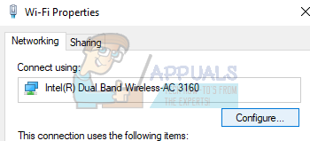 - Once the Properties have opened, click on the Configure button present at the near start of the window. You will be redirected to the properties of Wi-Fi hardware.