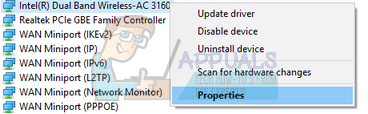 - Navigate through all the hardware and click on the Network Adapters Right click on your Wireless hardware it and select “Properties”.