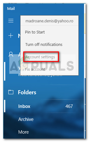 - In the Windows Mail app, go to Accounts in the left pane, right-click on the email that is refusing to sync and choose Account Settings.