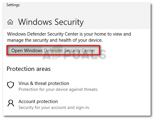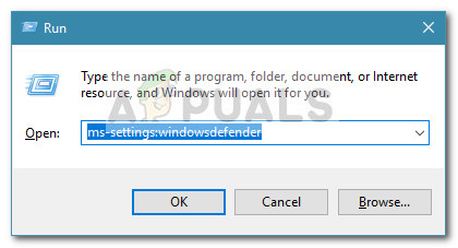 - Open a Run box by pressing Windows key + R. Then, type “ms-settings:windowsdefender” and press Enter to open the Windows Security tab of the Settings menu.