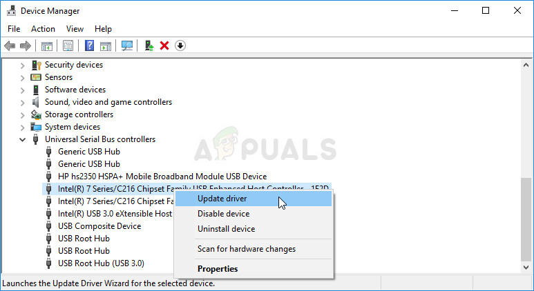 - Expand the Universal Serial Bus controllers section at the very bottom of the Device Manager window, right-click on entries beginning with Intel(R) or at least the ones with non-generic names, and choose the Update Driver option from the context menu.