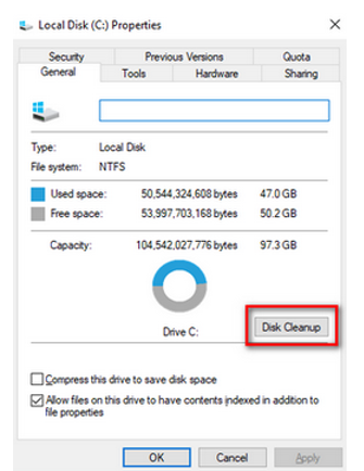 - Once in the properties, navigate to the General tab present at the top. Here you will see how much free space is available along with the used memory. Click the button which says Disk Cleanup.