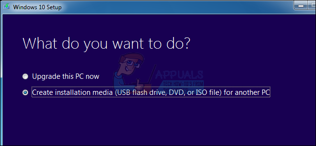 - Select the Create installation media (USB flash drive, DVD, or ISO file) for another PC option from the first screen which is displayed from the tool.