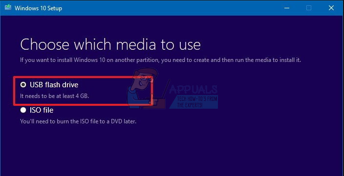 - Click Next and click on the USB flash drive option when prompted to choose between USB or DVD.