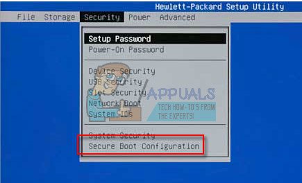 - Use the right arrow key to choose the Security menu, use the down arrow key to select Secure Boot Configuration, and press Enter.