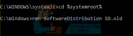 - Now type “ren SoftwareDistribution SD.old”. This command will rename your SoftwareDistribution folder to SD.old. By doing this, the computer will not find the SoftwareDistribution folder and will be forced to make a new one. You can always navigate to the file directory and backup the folder in case anything goes wrong.