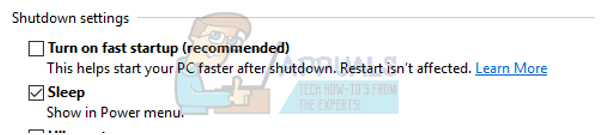 - Now head to the bottom of the screen and uncheck the box which says “Turn on fast startup”. Save changes and exit.