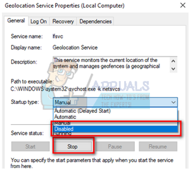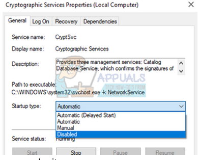- Now navigate to the General tab. Click on the button of “Stop” present under the subheading of Service status. Once you have stopped the service, click on “Startup type” and select Disabled from the drop-down menu.