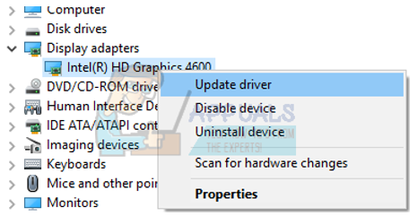 - Click on the Display adapters dropdown to see your installed display card. Right click on it and select “Update driver”.