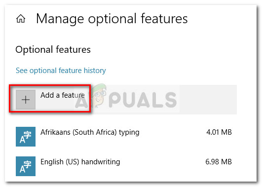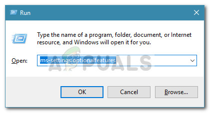 - Press Windows key + R to open up a Run box. Then, type “ms-settings:optionalfeatures” and hit Enter to open the Manage Optional Features tab of the Windows 10 Settings Menu.