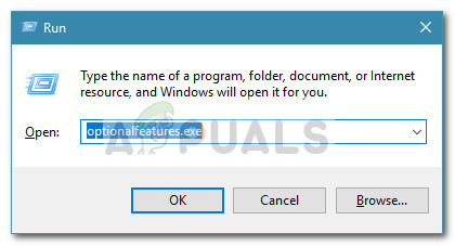 - Press Windows key + R to open up a Run command. Then, type “optionalfeatures.exe” and hit Enter to open the Windows Features wizard.