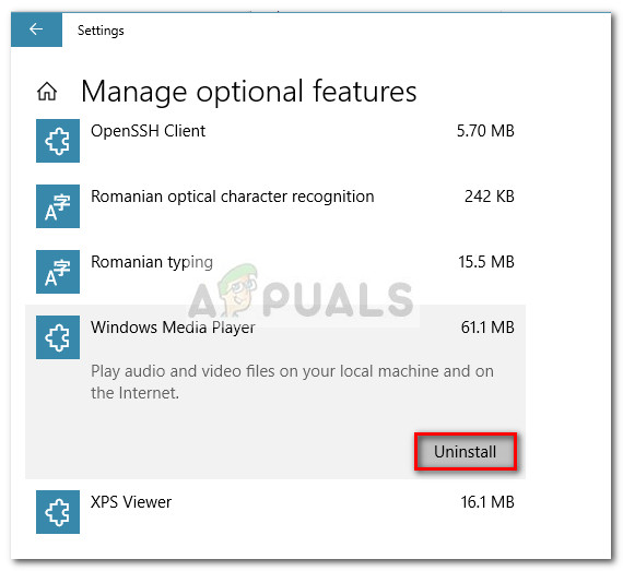 Note: Keep in mind that when compared to Method 2, the steps below will only disable Windows Media Player (not uninstall it from your system). While some users have reported that this is enough to allow the Spring Creators Update (version 1803) go through, some users have only managed to resolve the issue after uninstalling Windows Media Player completely (Method 2).