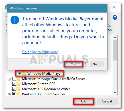 - From the Media Features folder, uncheck Windows Media Player and hit Yes and then Ok to save the changes.