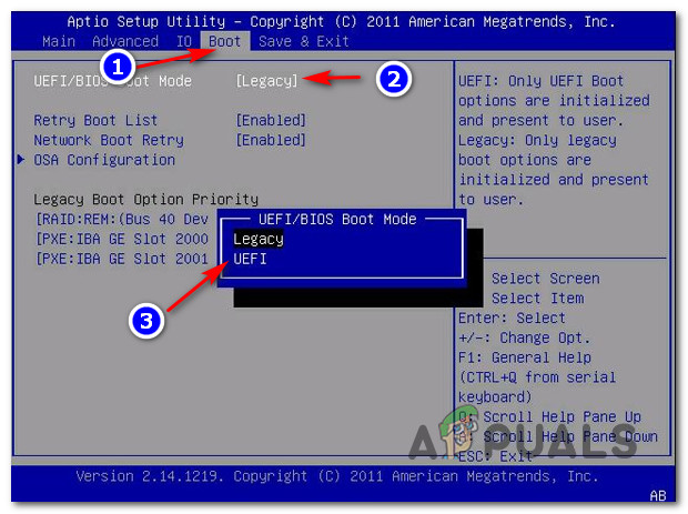 - Legacy Boot is preferred to UEFI – As it turns out, you might expect to get this error message if your current Windows 10 installation is wired to use legacy boot mode instead of UEFI (even if your system supports it). In this case, you can make the error message go away by accessing your BIOS settings and making the switch to UEFI.