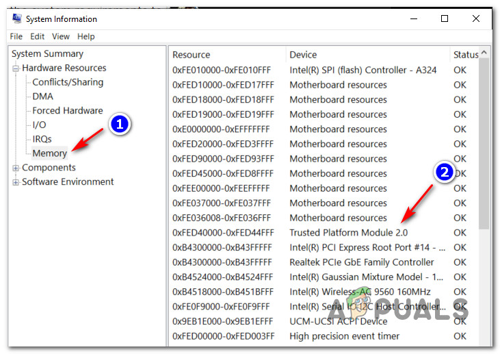 Checking if Secure Boot state is enabled - Finally, click on Memory from the left-hand side, then move over to the right and see if the Trusted Platform Module 2.0 status is shown as OK. If this is the case, TPM 2.0 is supported and enabled on your PC configuration.