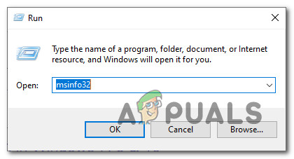 - Press Windows key + R to open up a Run dialog box. Inside the text box. type ‘msinfo32’ and press Enter to open up the System Information screen.
