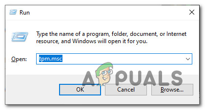 - Press Windows key + R to open up a Run dialog box. Next, type ‘tpm.msc” inside the text box and press Enter to open up the Trusted Platform Module (TPM) Management window on Windows 10.