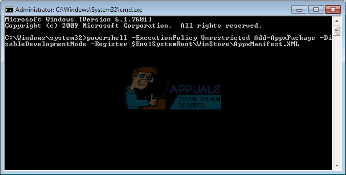 - Copy-paste or type this (without the quotes) “powershell -ExecutionPolicy Unrestricted Add–AppxPackage –DisableDevelopmentMode –Register $Env:SystemRoot\WinStore\AppxManifest.XML”