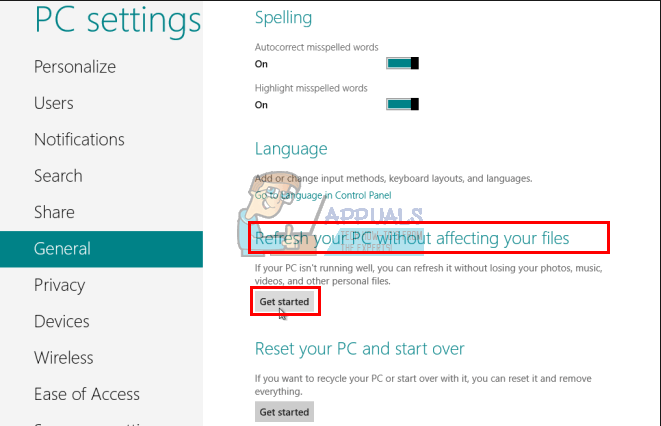 - Under Refresh your PC without affecting your files, click Get started (remember, this is not reset, but refresh)
