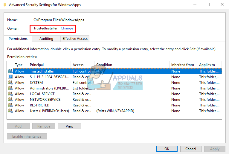 - For the owner it will show TrustedInstaller; click on ‘change’