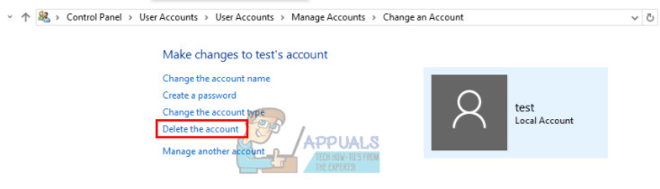 - Go to Windows + C > Settings > Control Panel > User Accounts > Manage another account, select user “test”, delete it and all files.