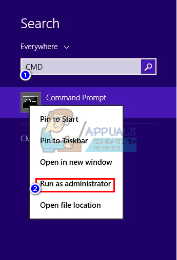 - On the left pane, right click on the “cmd” option and select “Run as Administrator”.