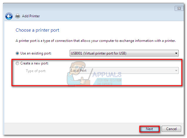 - When prompted to choose a printer port, click on Create a new port and select Local Port as Type of port. Then, hit Next to advance.