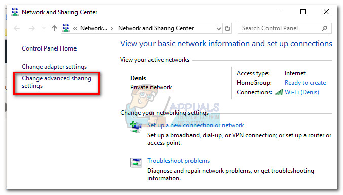 - In the Network and Sharing Center, click on Change advanced sharing settings.