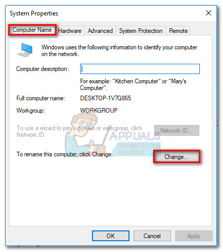 - In System Properties, go to the Computer Name tab and click the Change (Change name) button. Now write down or copy your Computer Name and close the System Properties window.