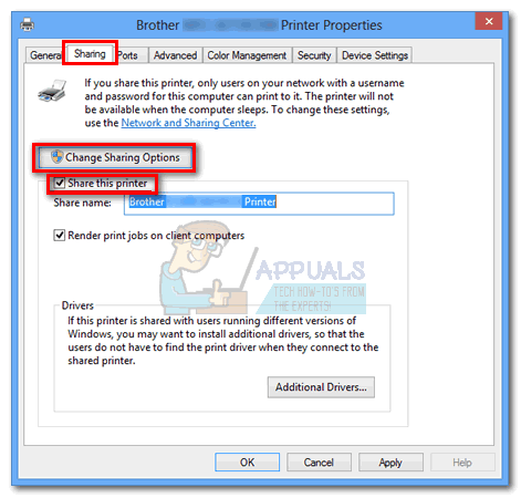 - In Printers Properties, navigate to the Sharing tab and click on Change Sharing Options. Then check the box next to Share this printer and give it a suggestive name (preferably short). Hit Apply to confirm the changes and close the printer’s Properties window.