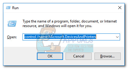 Note: Once you retrieved both the PC and the printer’s name, move to the computer that is on the receiving end. - Press Windows key + R to open a Run window. Type “control /name Microsoft.DevicesAndPrinters” and hit Enter to open Device and Printers.