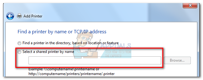- When prompted to find a printer by name or TCP/IP address, choose to Select a shared printer by name. Then, enter the correct names in the box below – the syntax should look like this: \\Computer name\printer name. Use the names that we previously retrieved while paying attention to use the correct format and hit Ok.
