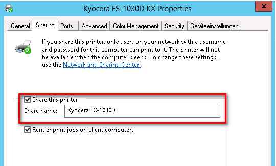 - In Printers Properties, navigate to the Sharing tab and click on Change Sharing Options. Then check the box next to Share this printer and give it a suggestive name (preferably short). Hit Apply to confirm the changes and close the printer’s Properties window.