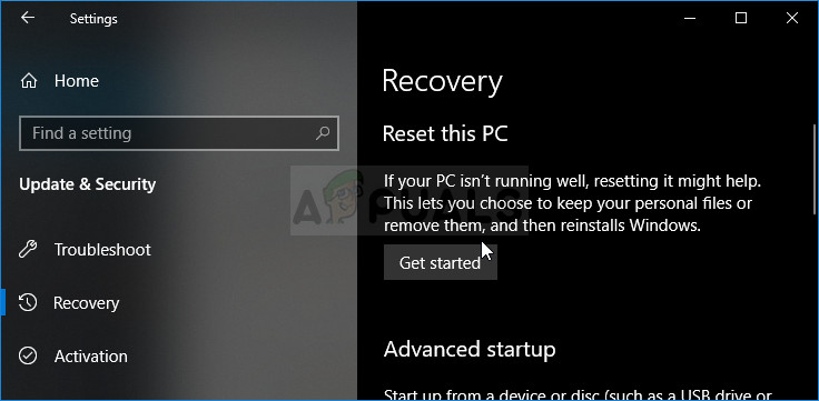 - Windows will show you three major options: Reset this PC, Go back to an earlier build and Advanced startup. Reset this PC is the best option for starting again with minimal losses to your files if you choose the correct option. Click Get started under Reset this PC.