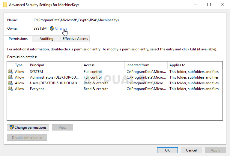 Taking ownership of the MachineKeys folder located in C:\ProgramData\Microsoft\Crypto\RSA has fixed the problem for countless users who have struggled with the same problem. The ownership should be transferred to your own user account if you are a local administrator. Follow the steps below to achieve this!