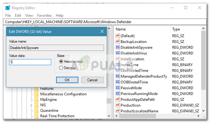 HKEY_LOCAL_MACHINE \ SOFTWARE \ Microsoft \ Windows Defender. Once you get there, double-click on Disable AntiSpyware from the right-hand pane and change the Value data from 0 to 1.
