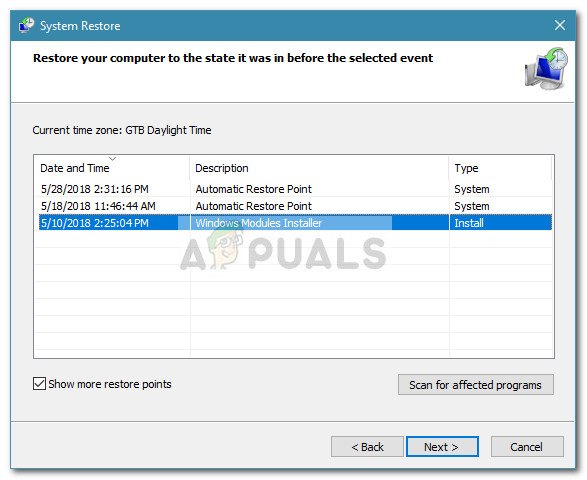 - Next, pick a restore point dated before you started experiencing problems with Windows Defender and hit the Next button yet again.