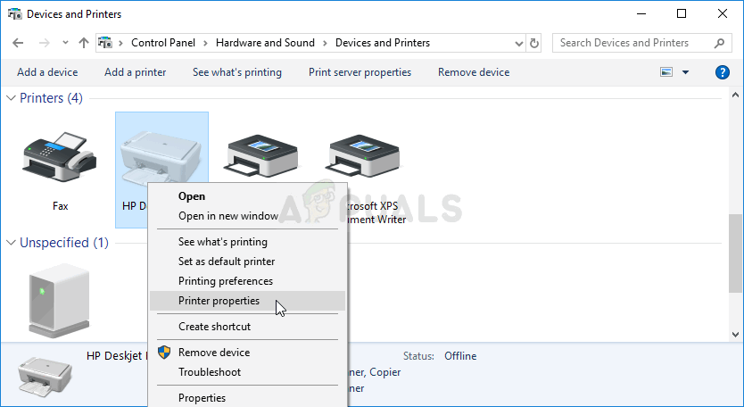 - Right click the problematic printer and you should notice that a menu will come up. Select “Printer Properties” from the new menu and click the tab which should be labeled as Ports.