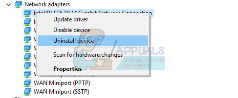 - Expand the node next to Network adapters, right-click the on the entry which should be named similar to the program which installed it. If you are not sure, perform a Google search for each of the devices you see under the Network adapters section and conclude just which one you should uninstall by right-clicking on it and selecting the Uninstall device option.