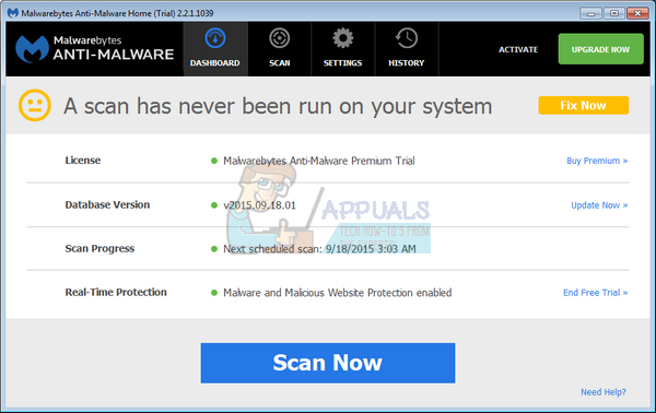 - Once installed, Malwarebytes will automatically start and update the antivirus database. To start a system scan you can click on the “Scan Now” button.