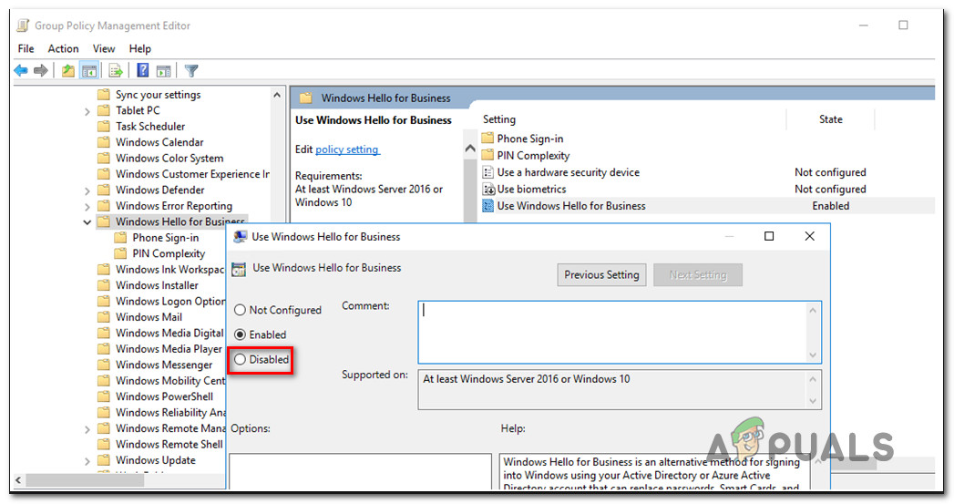 - Windows Hello for Business policy is Enabled – This Local Group Policy is known to cause constant Event Viewer errors related to Windows Hello. Most affected users have reported that the errors have stopped appearing once they used the Local Group Policy Editor or Registry Editor to disable it.