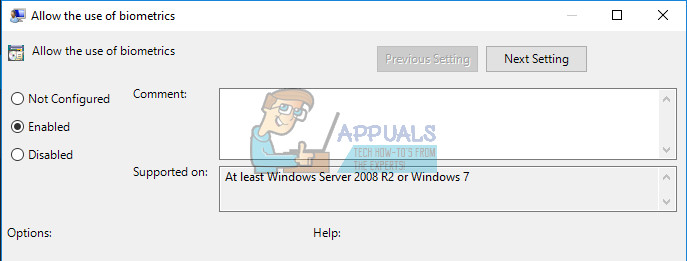 Someone might have accidentally disabled biometrics on your computer or one of the programs you installed recently might have changed this without your permission. Either way, enable it by following the instructions below and check to see if Windows Hello is working again. Make sure you check this after you have tried all of the solutions above.
