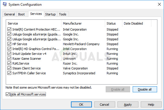 - Under the Services tab, click to select the Hide all Microsoft services check box, and then click ‘Disable all’.
