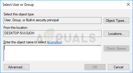 - The Select User or Group window will appear. Select your user account via the Advanced button or just type your username in the area which says ‘Enter the object name to select’ and click OK.
