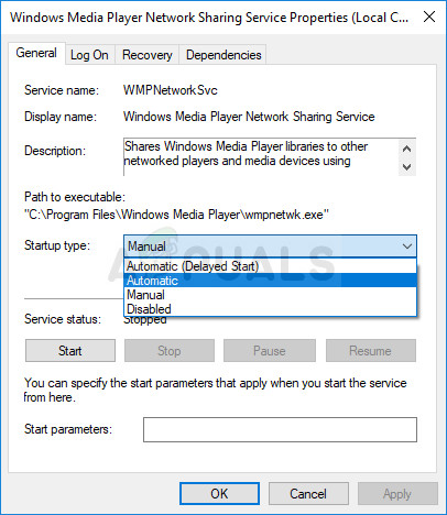 - Make sure that the option under the Startup type section in Windows Media Player Network Sharing Service’s Properties is set to Automatic before you click the Start button in order to restart the service and check to see if the problem is solved.