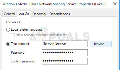 - Follow the steps 1-3 from the instructions above in order to open Windows Media Player Network Sharing Service properties. Go to the Log On tab and click on the Browse… button.