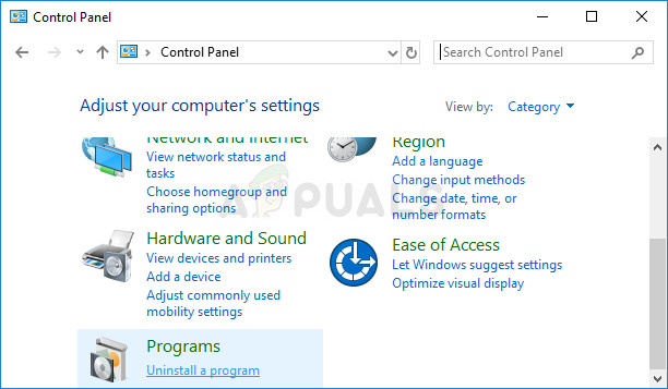 - Change the view in Control Panel to View by: Category and click on Uninstall a program under the Programs section.